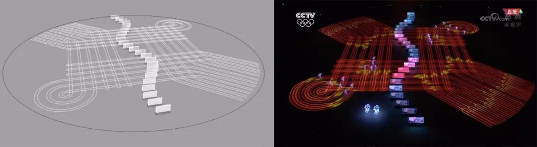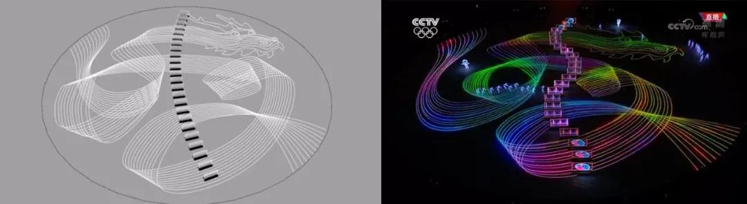 整个演出中,演员与冰屏共同在地幕上勾勒出了龙、凤凰、中国结、扇子等多个具有中国文化代表性的传统元素。