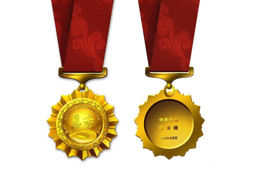由中共中央、国务院颁发给为2008年北京奥运会残奥会做出突出贡献的先进个人。造型简洁,以本届奥运会核心辅助图形吉祥云纹为主题,结合主场馆进行设计,主题突出明确。