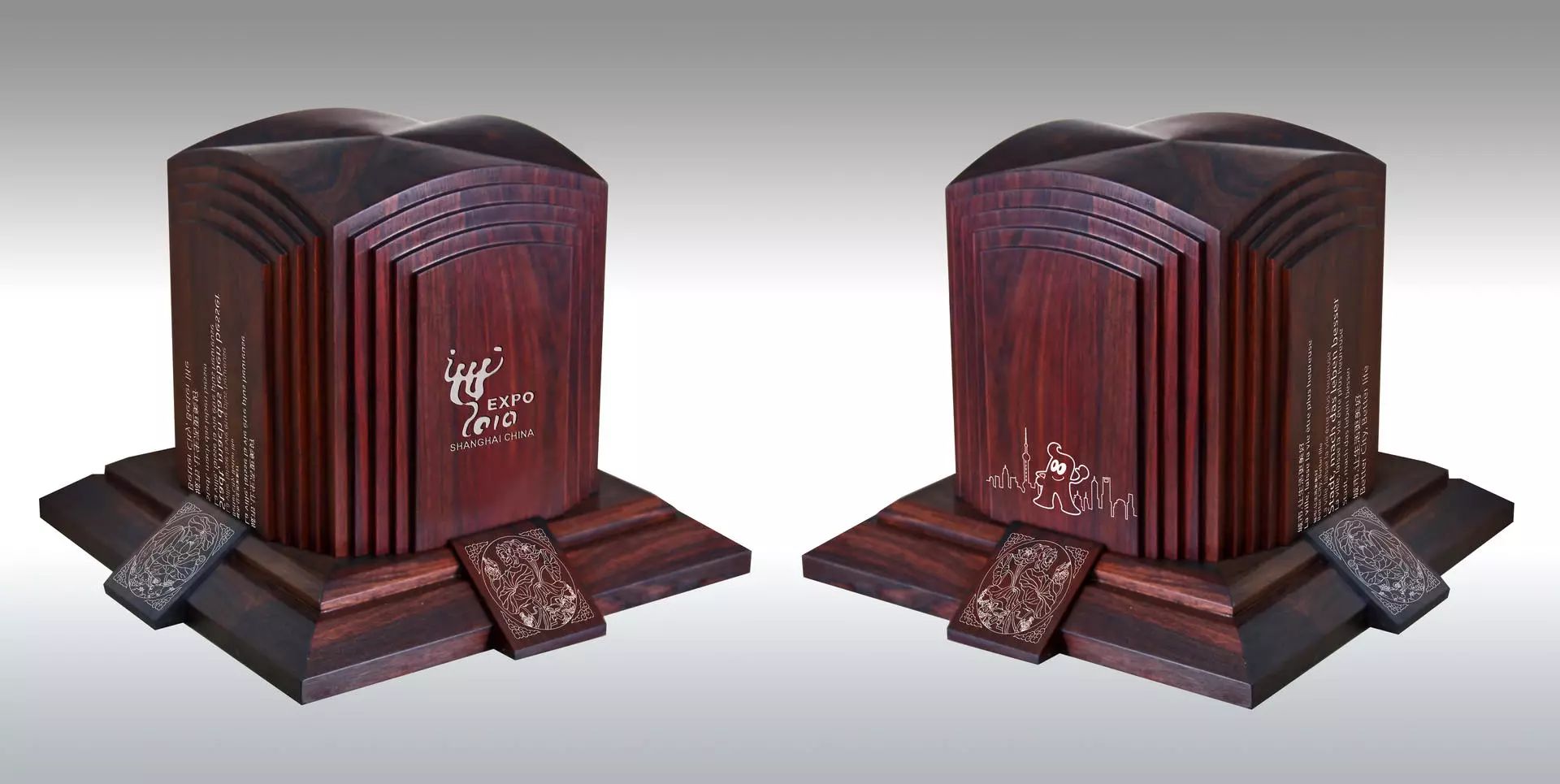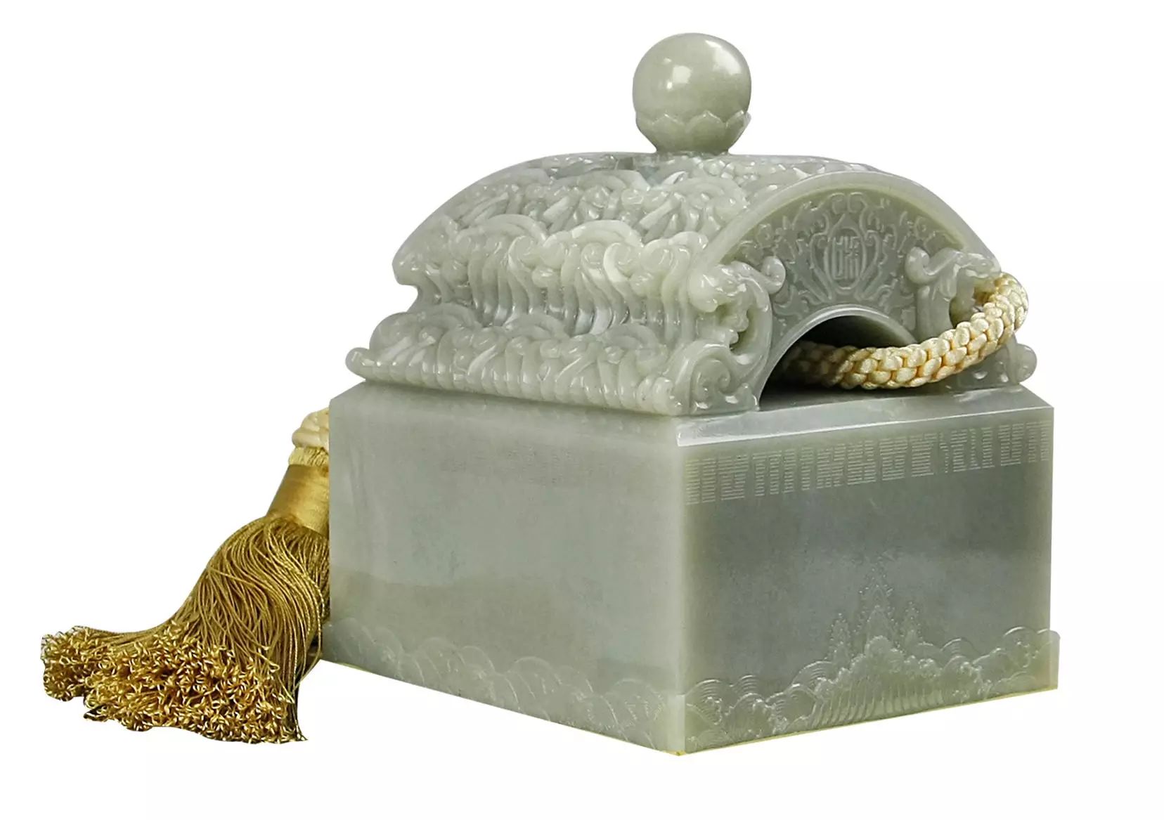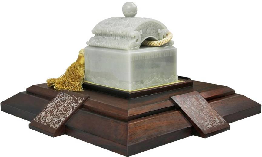 2010年上海世博会唯一官方印玺。由上海市政府赠送国际展览局永久收藏。以上好和田青白玉为原料,采用国家级非物质文化遗产玉雕工艺制作完成。器型硕大方正、造型敦厚,以中国传统瓦钮印为基础,结合上海地域特点和本届世博会“城市,让生活更美好”的主题理念,创新设计了本款上海世博徽宝。