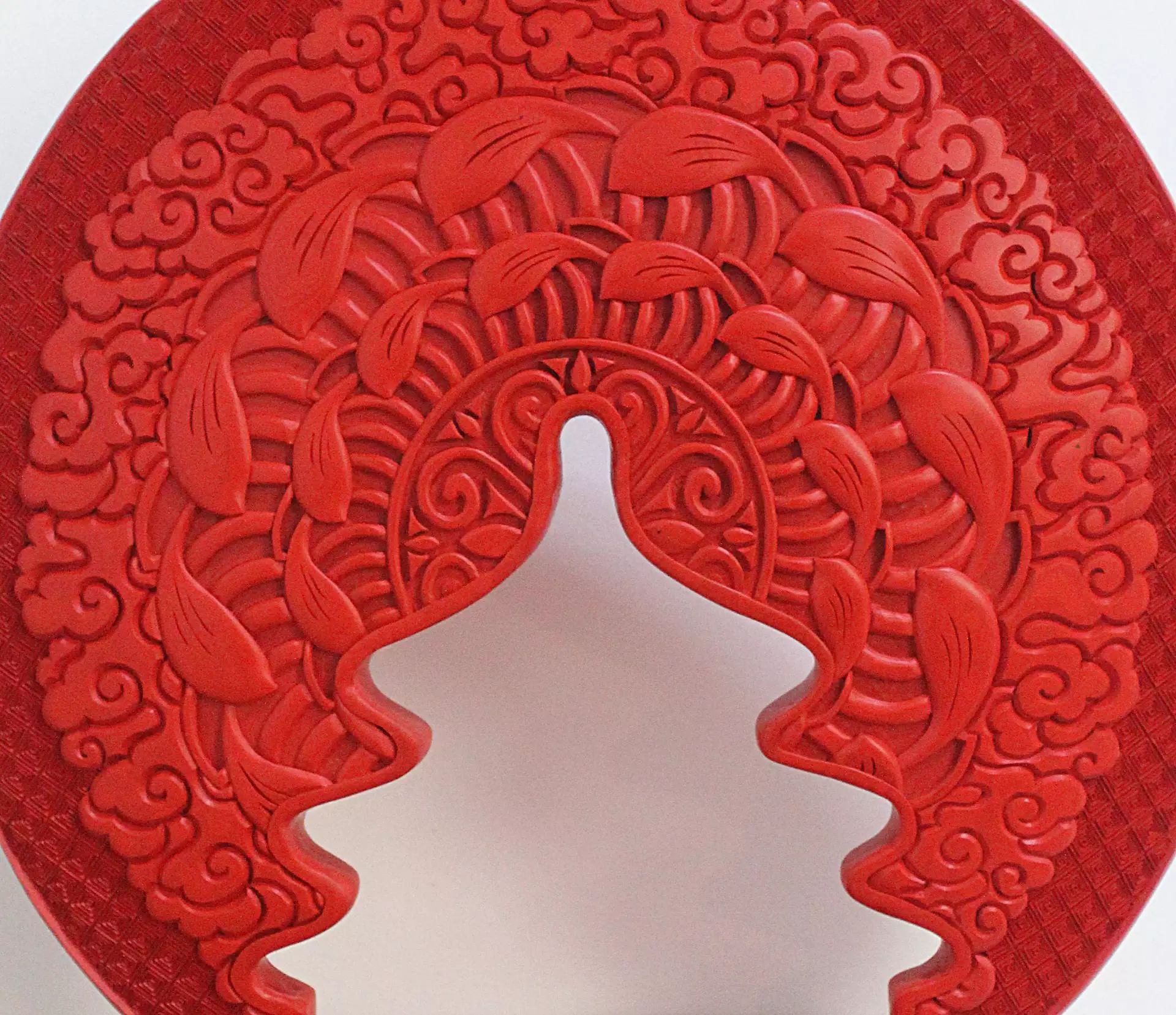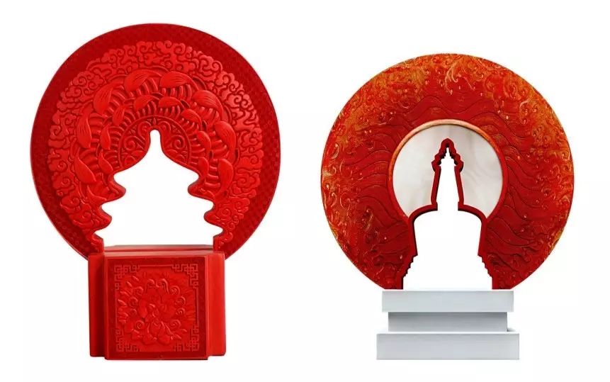 佛教理论中,空即是色,色指一切可感知物质和精神。因此,空和有属于事物的一体两面。本创意从佛法精神的空有切入,把虚实相结合的设计方法应用到对空有的表达上,虚实结合、以虚为实的表现形式在工艺美术的创作中具有一定的实践性。作品以国家级非物质文化遗产雕漆工艺制作完成。