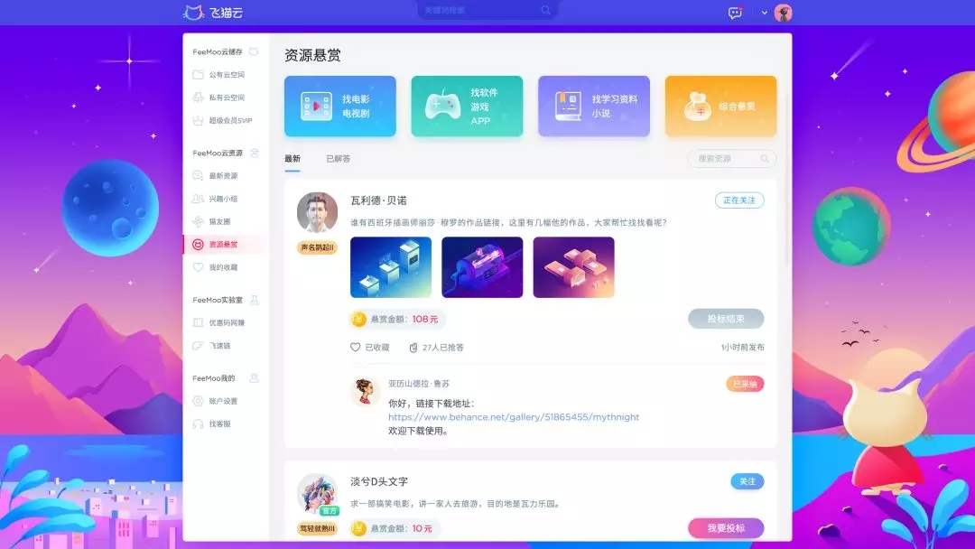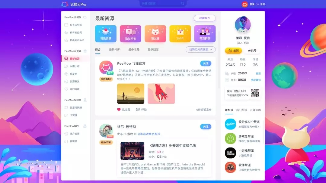 使用纯度较高的对比色,令每个界面更加酷炫、夺目,同时减少了一些框、线等干扰性元素,刺激用户的视觉感受,突出页面的主体范畴,弱化不相干的元素,通过这次改版,颠覆了大家对于传统网盘的陈旧印象。