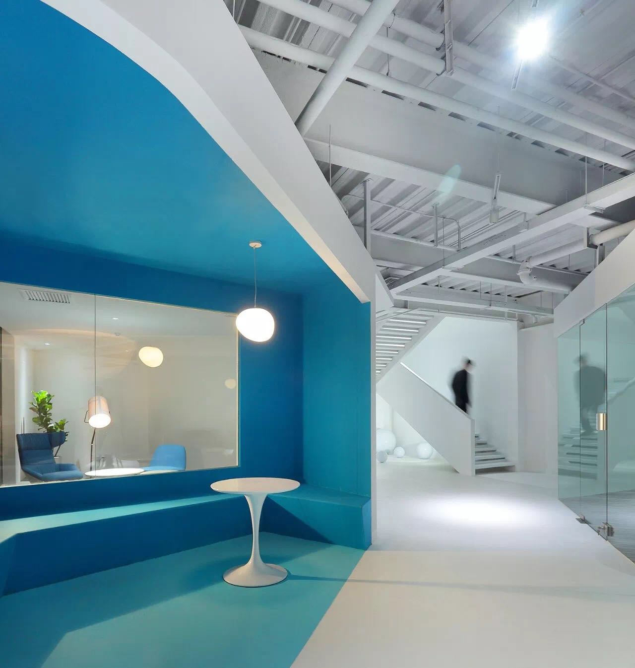 空间共分为两层,每个功能空间在流畅的做了几何切分处理的动线中被合理地镶嵌进去,同时我们认为好的办公应该是有颜色的。空间中,我们不能控制选择怎样的工作互动,但首先引起的则是看到的色彩,这些色彩空间也产生了不同的功能属性,自然的和这些影视人产生互动。