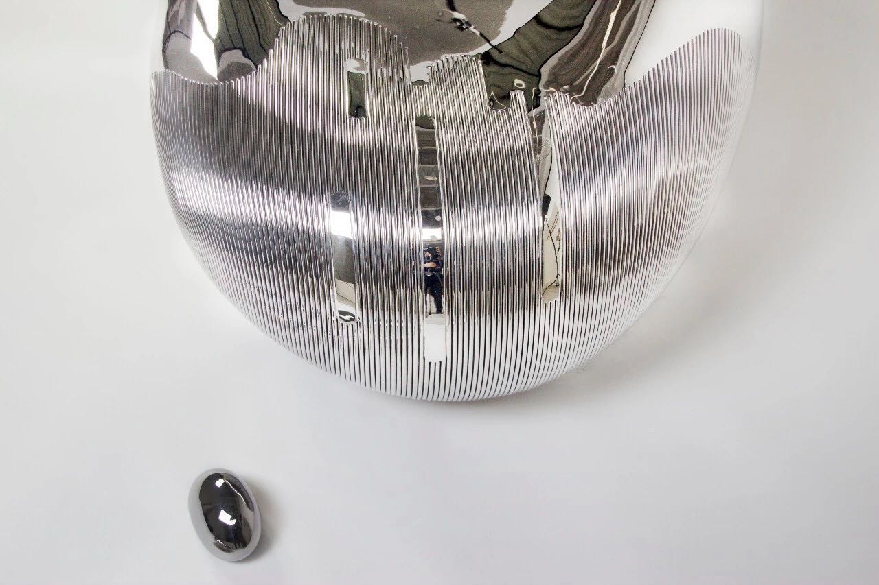 作品的材质选择镜面不锈钢,经过精致的工艺打磨,将万物天地真实的反射其中,仿若无色无味,其实希望表达自我的准确态度是真实的吸收世间的所有颜色,借以达到多姿多彩的表达。