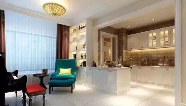 将中式如意演变成云纹图案的屏风无疑是餐厅的点睛之笔,藏蓝色的餐桌椅,在留白的空间里,如大海中泛起的白色的浪花,现代感十足,配以驼色的窗帘,乍看去色彩碰撞,但在碰撞时又和谐自然,毫不做作。