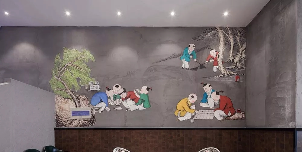 大厅设有等待区,桌椅整齐有序,墙壁的彩绘生动的描绘了清朝年间吃火锅的热闹场面。