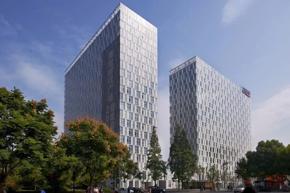 项目位于杭州天目山路,利用基地自然条件,沿街设置板式高层,围合出北向相对安静的内院,下沉庭院不仅有效解决地下室通风采光,同时也丰富室内外空间。8.4的柱网,两跨的空间,四边各2.1米的出挑使每个建筑单体均成总厚度为21米的薄板组合,外向界面采用磨砂玻璃和透明玻璃与双层立面结合,内向界面采用石材与玻璃幕墙相结合,既符合朝向要求又形成不同表情。宛若两块“白玉”成为杭州的西大门。