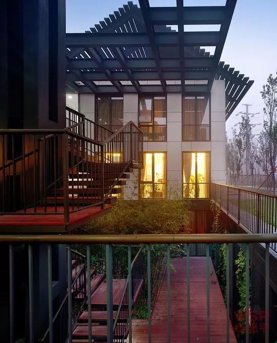 项目以居住在风景中,在画中游、画中住为规划概念。四栋单体建筑通过钢结构连桥相连,形成S型,从而围合出两个内庭院,南庭院开放,北庭院靠近主楼(北楼),相对私密。钢结构的连桥使四栋建筑在二层的外走廊可以相互连通,解决交通问题的同时,也形成了连廊和观景平台,从而使室内外有了过度的空间关系。