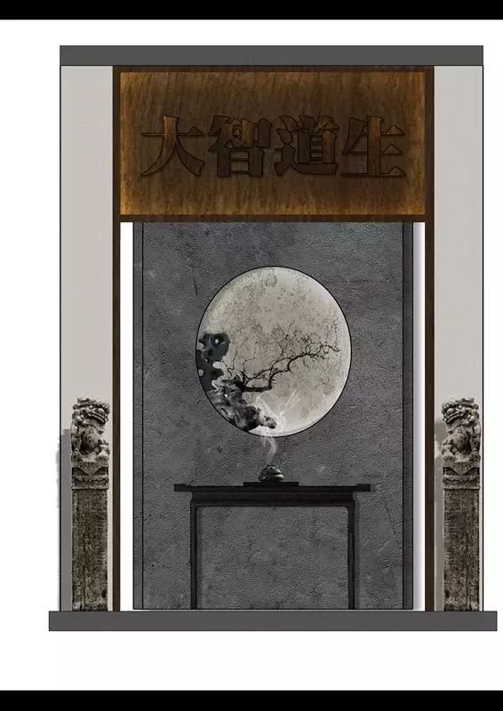 入门口处的迎门墙我们用水泥漆这种质朴的材料对墙面进行装饰,造型上我们采用明月高悬的构思自然营造出一种宁静祥和的气氛。让人进入空间第一时间可以感受到禅的“静”淡黄色的朗月,幽静的朗月与枯枝浑然天成一种柔美的诗画意境!