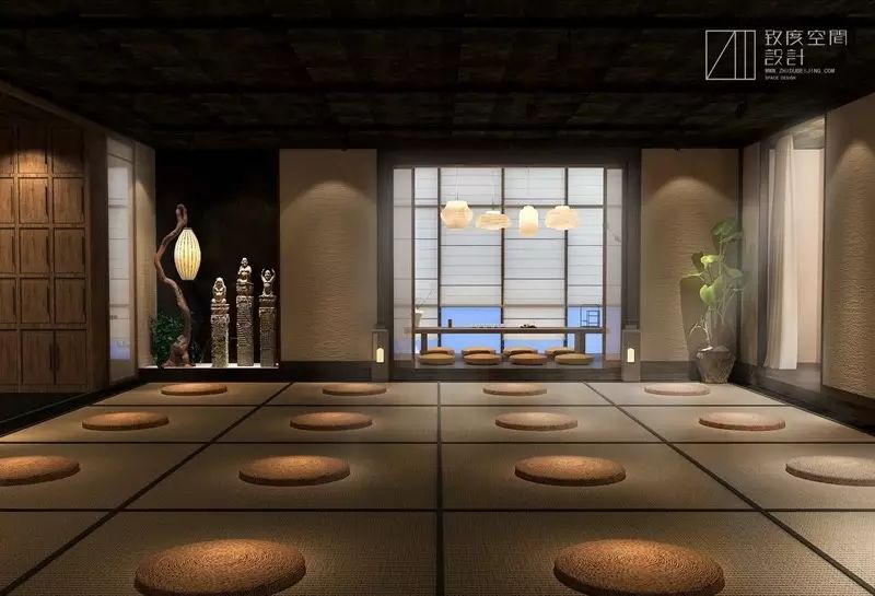 实木的茶桌,书架,原石的摆件很好的展现了禅茶一味的意境...... 大厅满铺榻榻米草席,讲台处两组书架和深邃深咖色的亚麻窗帘作为视觉引导自然营造出庄重的敬畏感!四周的错层为实木饰面,配合实木茶桌,剑麻地垫,禅意十足的茶器以及造型简单的麻质吊灯!随处可见的绿植瓦罐装饰,自然营造出我们想要的“静”与“雅”。