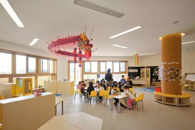 教室内的集中活动围绕中心的圆柱展开,临近外墙有专门为孩子设计的凸窗空间,是他们阅读和照料小植物的场所。