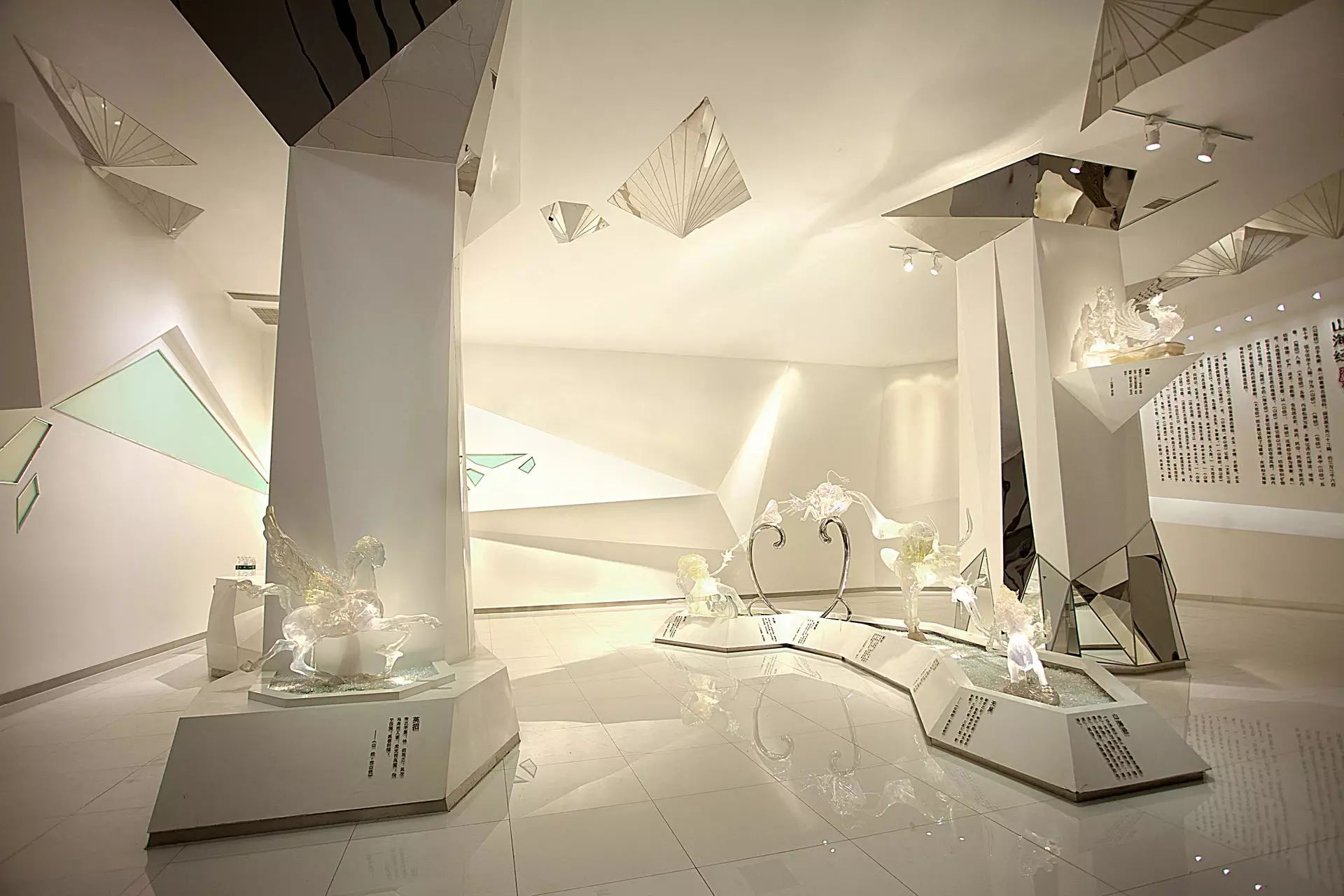 展厅选择了《山海经》中描述的吉祥之兽,以水晶树脂材料做成群雕。这些神话角色本身具有很强的现代感,设计者通过艺术的手段独立的再现出古人的想象力。