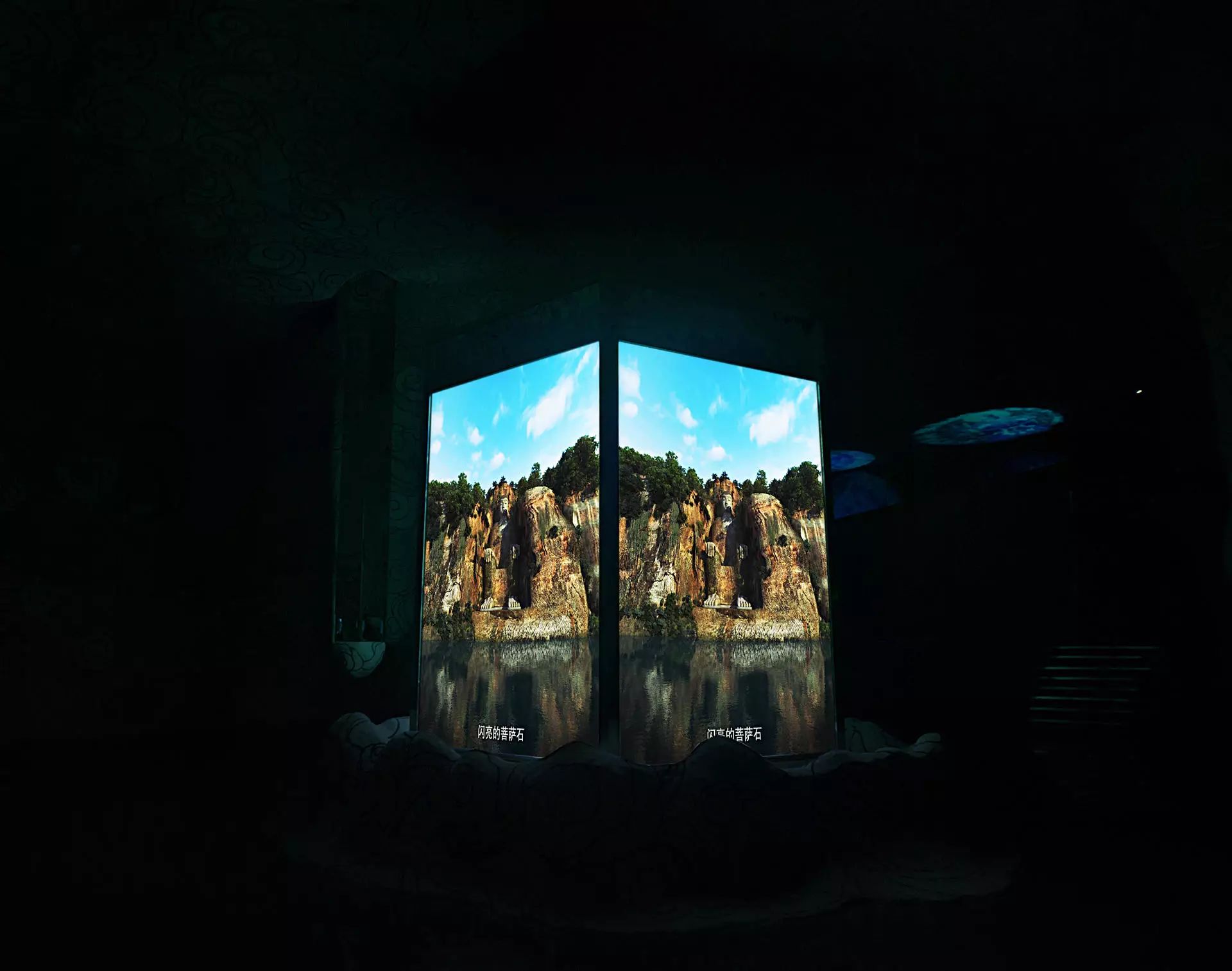 接下来看到的是岩洞两侧的八尊本命佛,分别保佑十二生肖。随即整场灯光变暗,中央的水晶柱亮起,开始播放一部关于乐山大佛的影片。
