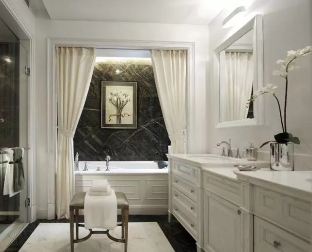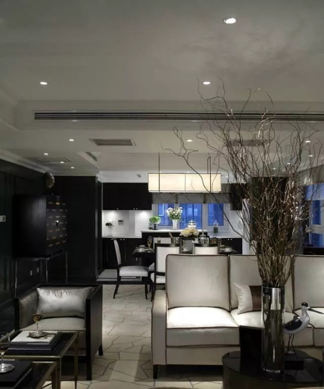 公共区域顶面天花是一个通透质感的镜面不锈钢材质的“水滴”造型,犹如雨后最后一滴水珠,在平静的水面上荡漾开来...空间整体为简约的现代风格,客厅壁灯为白色云石水滴造型,地毯为水波纹涟漪图案,水滴元素相互交织,展现出诗意东方的美。