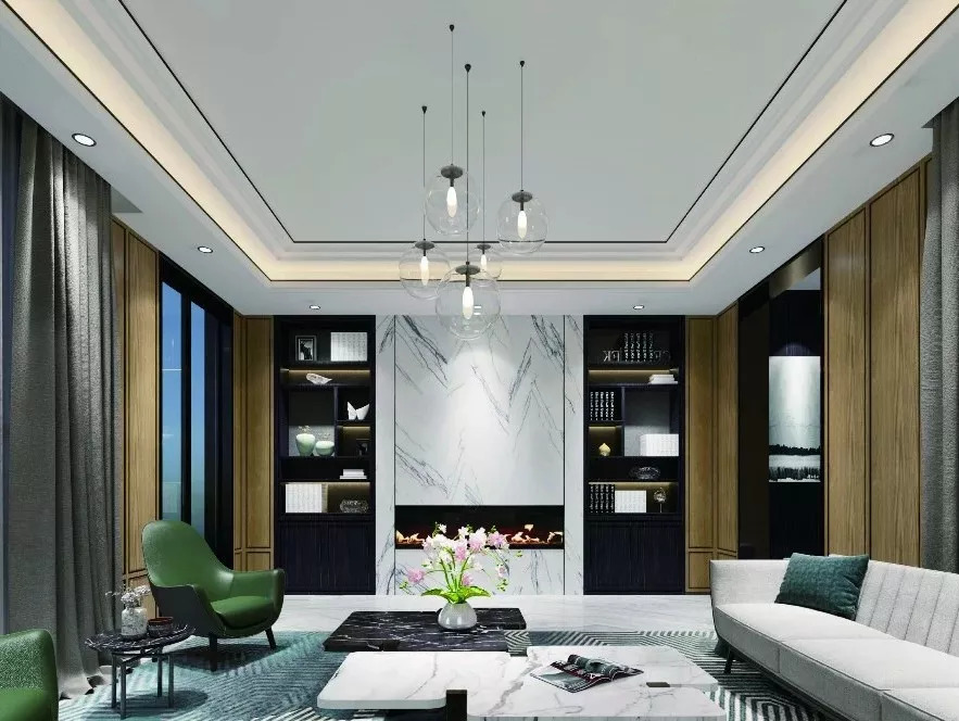 客厅与餐厅连贯在一起,墨绿、白与少量的黑色是整个空间的色彩基调,宛如一幅油画再现了立体水墨山水。