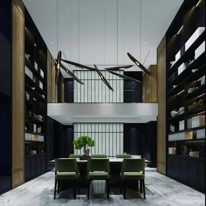 项目整体设计以墨绿色、白色和少量的黑金色构成整个空间的色彩基调。其中入口玄关处借鉴贵阳当地苗族服饰图案的元素,用铜制镶嵌绿松石描绘出当地的文化符号。客厅中“雁南飞”自然元素的吊灯,体现了格调高雅、奢华的意境。