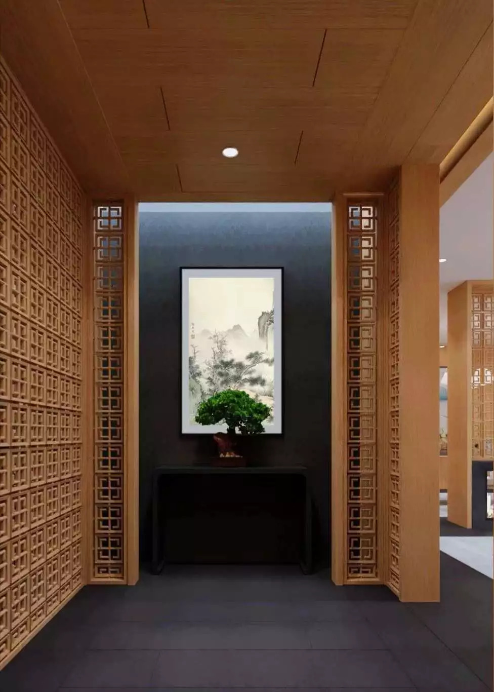 在设计中大范围的黑、白、咖与雅致的灰绿相搭配,配以简洁造型的家具,东方韵味的色彩搭配展现了低调、大气。在不同空间,色调也有不同层次的变化。以温和的色系强调温馨的归属感,沉稳的大理石与硬朗格栅之余,温润的木材丰富了细节,随动线发展衍生出变化。