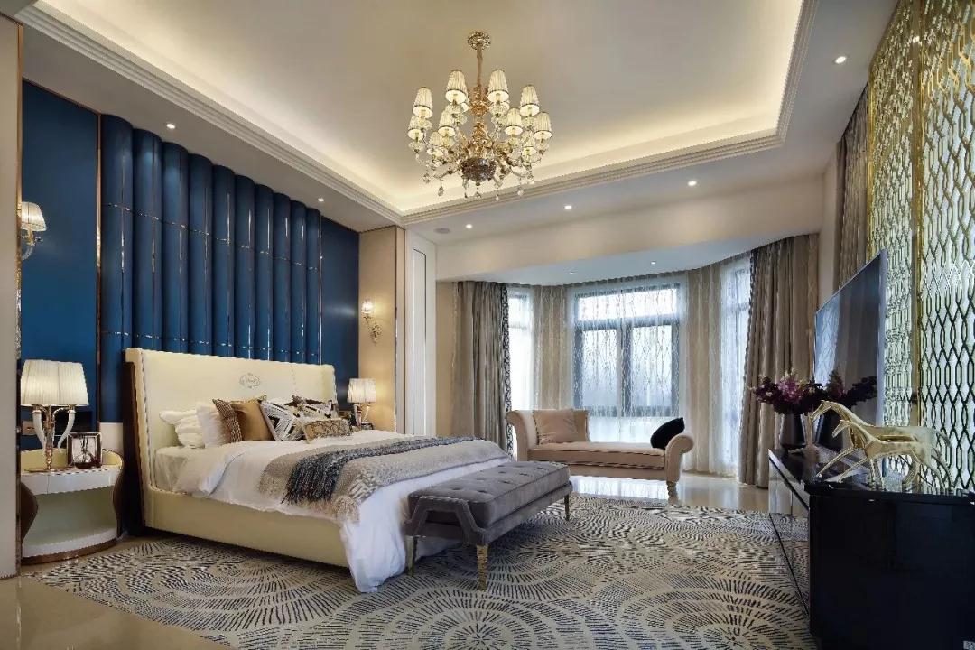 采用挑空的设计布局,瞬间给人一种大气、奢华的视觉感受,再配以时尚纹样的蓝色大理石作为墙地面的装修用材,香槟金不锈钢条作为点缀,奢侈品牌家私与精致配饰锦上添花,丰富色调的同时凸显了空间的时尚典雅。