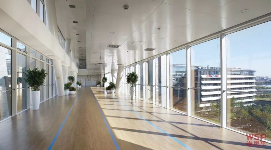 建筑采用低技高效的设计手段,9000mm的超薄进深使建筑空间能最大限度得到自然采光与通风,搭配高效节能的空调与地暖,空间达到真正的冬暖夏凉。模式化的建造方式使建筑材料尺寸相对统一,900mmx900mm模数单元从广场延伸到建筑外立面、钢结构连桥、管井以及室内的每一个细节,建筑、景观和室内一气呵成,空间气度不凡。从建造上来讲,一方面使施工更加方便准确,另一方面也增加了场外定制的工作,从而减少了施工现场的作业量。通过设计,控制了在施工过程中对周边环境的破坏。