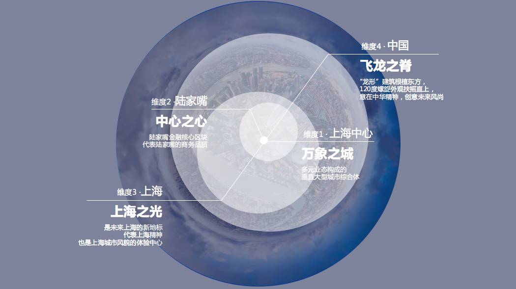 基于上海中心包容与兼并的特点,设计师提出了“万象之城”的维度——“满足广泛的用户群需求,体现建筑的多功能综合体特质,打造集经济、文化、金融、休闲、旅游为一体的多功能便捷生活圈,兼容并蓄,包罗万象。”