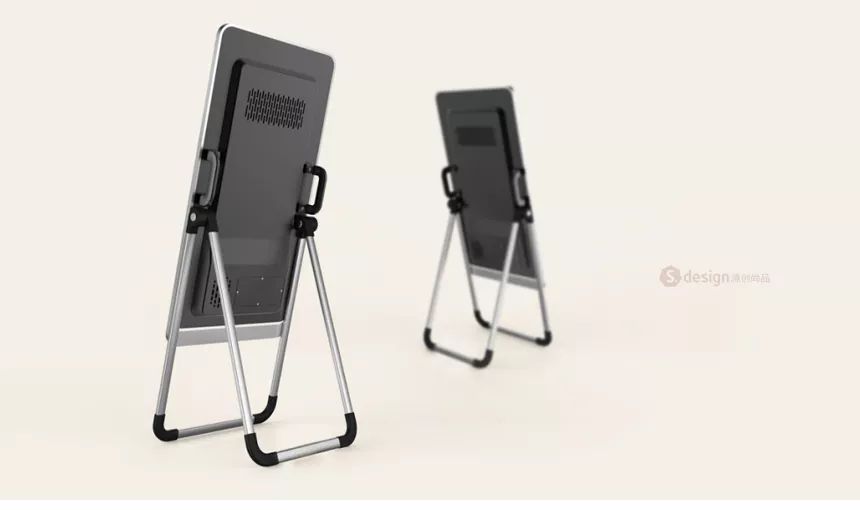 可折叠、易收纳、可拖行、易移动是产品的基本诉求,s.design设计团队根据需求设计了一种打开时用手拨开,成一定角度,机构卡死锁紧,收起时,微微往上拉,机构解锁、自动弹回收折的创新方案,让产品随意移动摆放不再是难题,令传统笨重的广告机也可以如此轻盈,富有现代科技感的屏幕设计及灯光展示效果让产品独具特色,不只是广告吸睛,她也是广告模特。