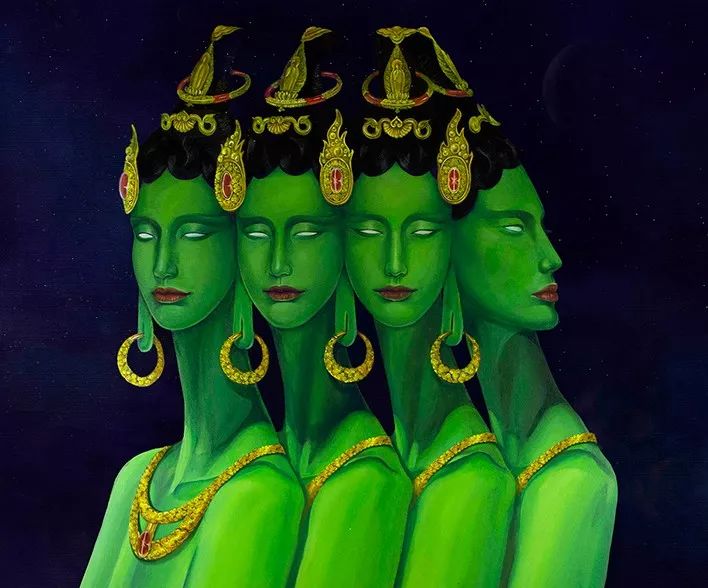 创作于2015年,于敦煌学习归来后的首次以敦煌为主题的原创作品,灵感源于敦煌瓜洲县榆林窟第三窟观音图,白衣观音身后以平面的方式大胆注入了芭蕉叶的元素,有两只鹦鹉盘旋在他的左下方。于2016年被藏家私人收藏于广东番禺。