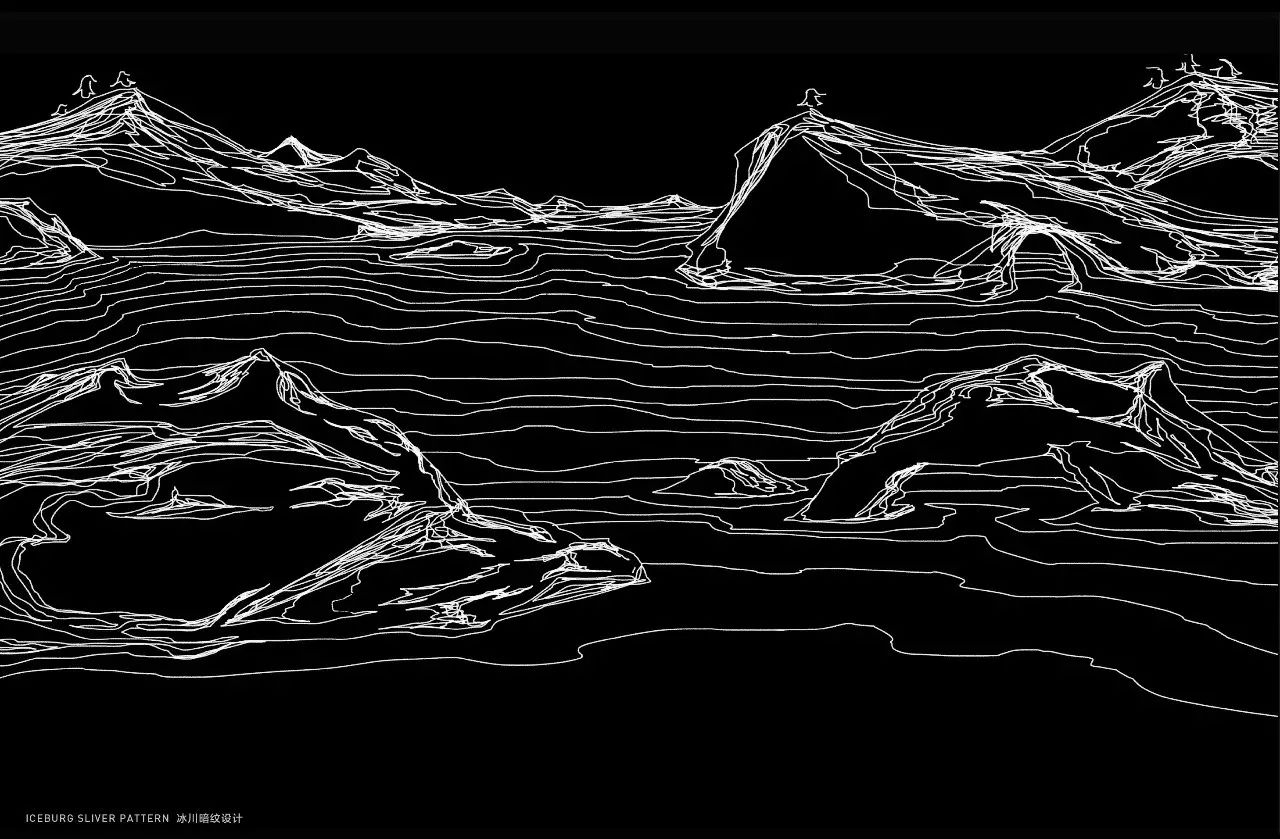 在开合处,我们还设计了银面冰川纹样以增加层次感,烫印的风格是比较随性浪漫的法国手绘风格。你发现冰川中藏着的企鹅和酒瓶了吗?