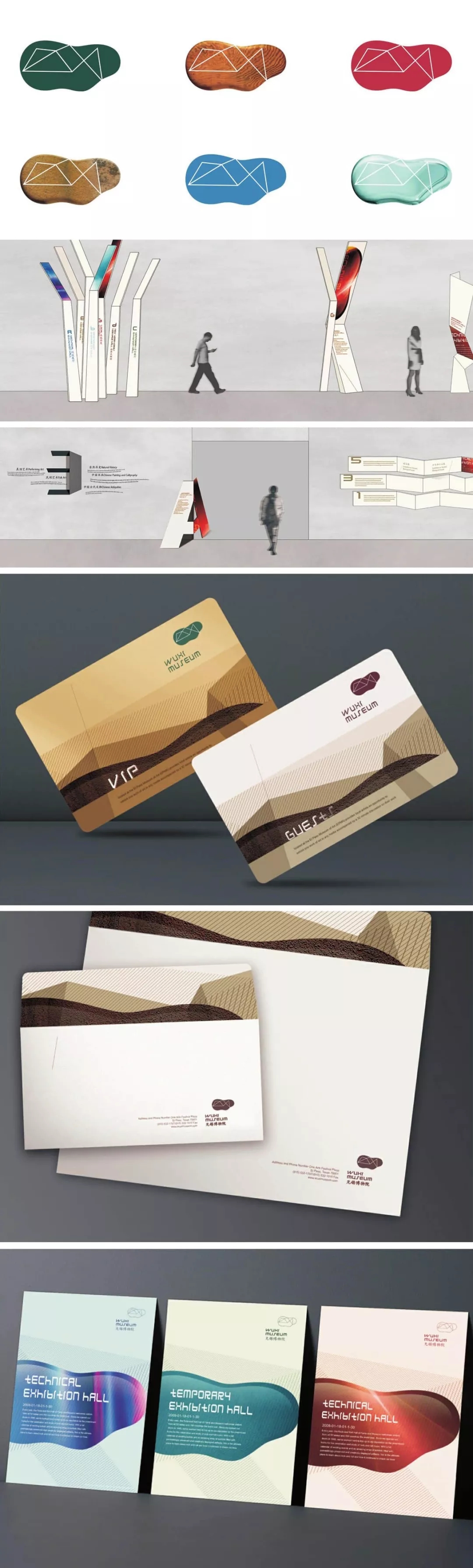项目团队从无锡的地域特征、人文历史以及无锡博物院的功能出发,将潋滟水光、玄美石色融汇一体,将传统元素与现代感的材质、表现融合于一,展示给大众一个有声有色、有性格有包容、有历史有未来的无锡博物院形象。曲线代表流动的水,体现了无锡的地域特征,象征包容、和谐;直线条的几何图形,是无锡博物院建筑体的概括,又构成“W”、“X”、“M”无锡博物院的英文简称。