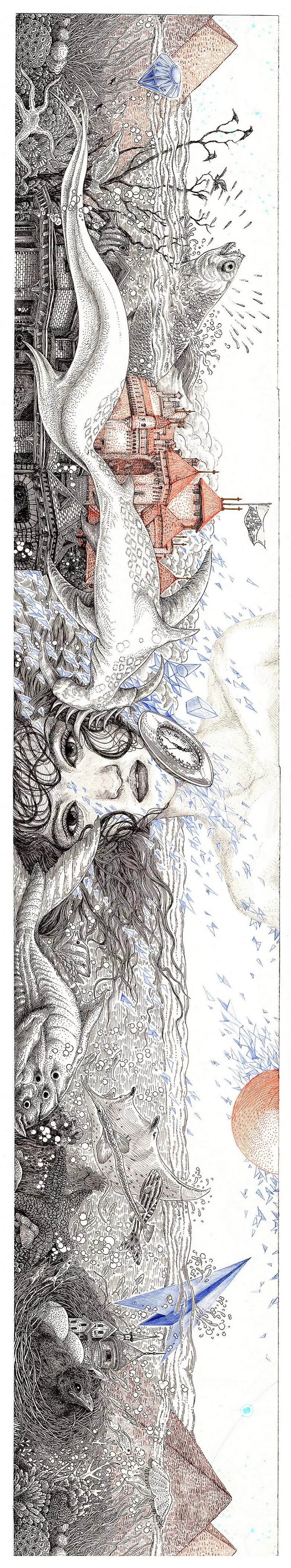 《奇异梦世界》用时50小时左右,是由四张纸连接成的图,首尾也可以连成一个圆柱形。绘画的过程完全是推着画的,没有打铅笔稿,也没有提前构思,完全跟着潜意识而创作的。