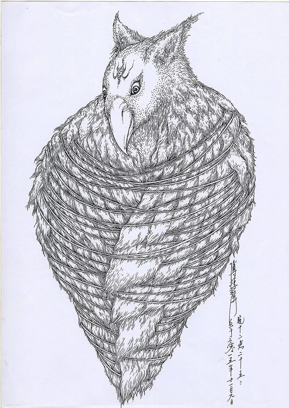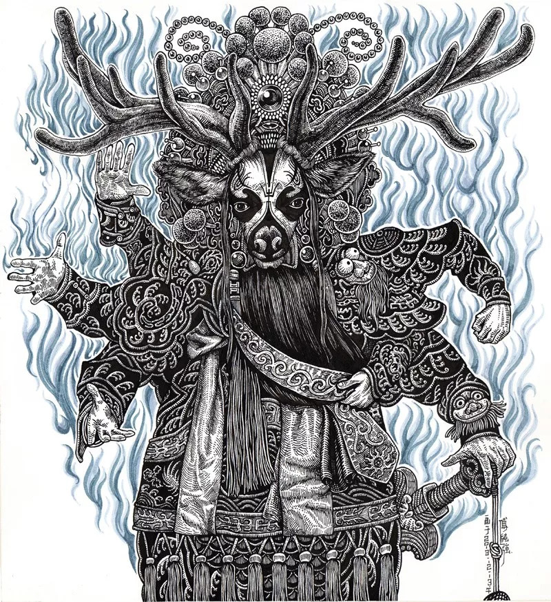 《饕餮》用最简单的创意,就是一张血盆大口,吃遍天下所有。所以,我结合了很多不同的元素,来构成“饕餮”:青蛙、蝎子、蜥蜴、小鸟、蜈蚣、苍蝇、海龟,眼镜蛇等等。主要靠的是耐心,一笔一点地完成。