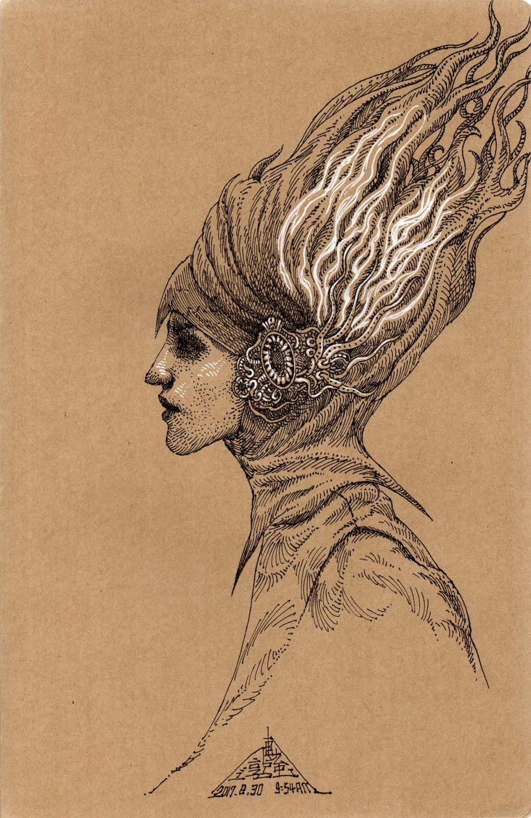 作为画面构成来说,黑白线体主义,就是用点线面黑白灰大中小 ,这九大基本元素,通过不同的表现手法来诠释画者对事物的理解。《傲慢》,我所呈现的是一副骄傲的面庞,冰冷的目光,华丽的装饰,阴险的尖牙,还有邪恶的守护龙。通过这些细节,来为整体的傲慢服务。
