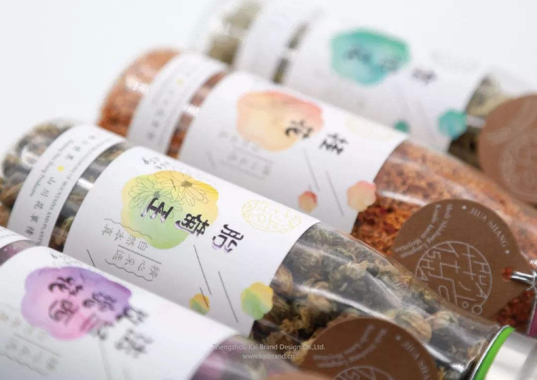 想要把花茶的清新与干净通过字型设计和版面构成来体现出来,抽象简洁的斜线条和写实的花朵形成两种对比,以此来营造一种独特风格,使产品能在市场上脱颖而出。在不同颜色的水彩底纹下,体现花的意象与品牌标志的联系性,建立一种可以适应花茶多种类别的“公式”,让变化与统一更加自然。