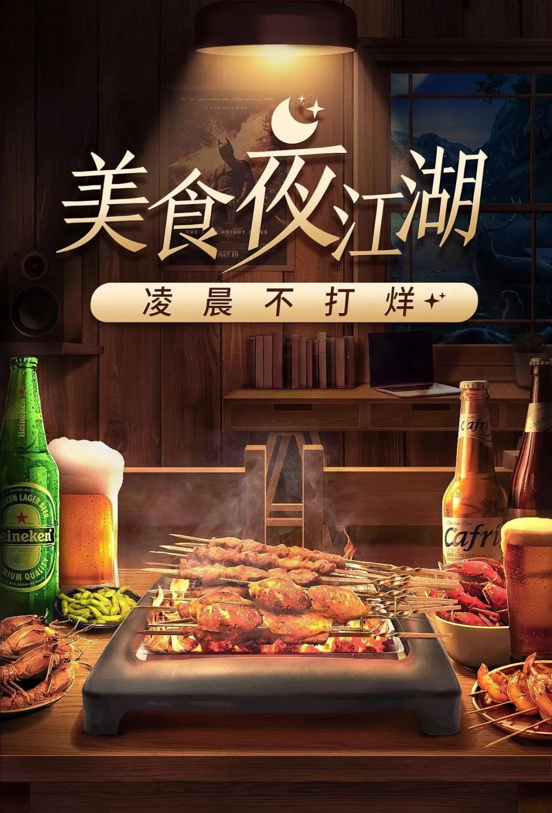 每张夜宵画面的用光方式和氛围营造以及场景搭建都不同,可以看出,李宁对美团外卖夜宵活动的设计进行了场景化设计的风格探索。