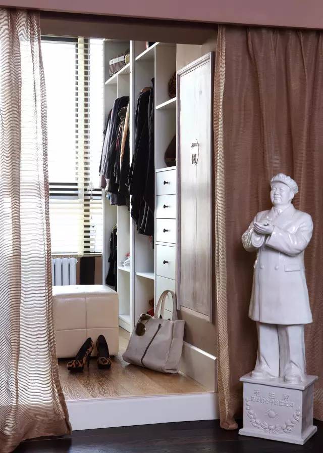 主卧则选择了中式风格浓郁的镂空隔屏作为床的背景,同时分割了空间、大斜角的房间一下变得规整。运用黑、紫的浓烈反差,使得主卧在沉稳的同时不乏浪漫。