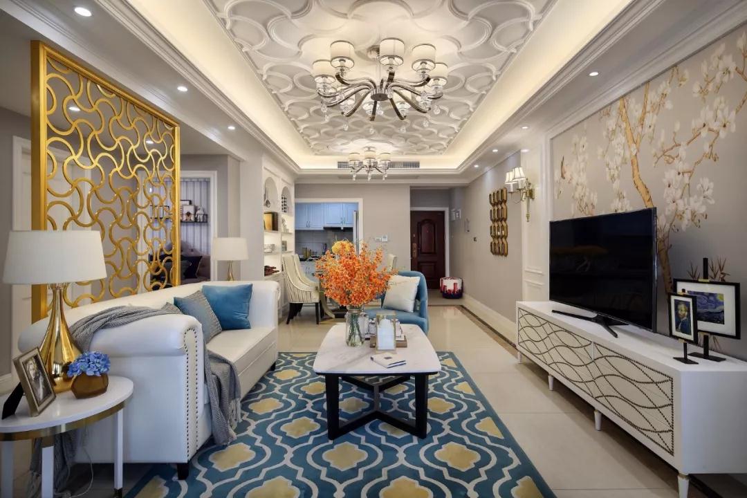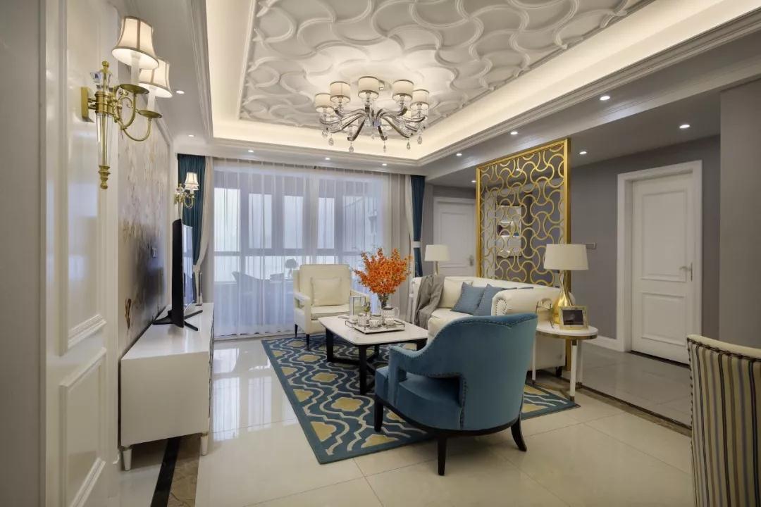 采用挑空的设计布局,瞬间给人一种大气、奢华的视觉感受,再配以时尚纹样的蓝色大理石作为墙地面的装修用材,香槟金不锈钢条作为点缀,奢侈品牌家私与精致配饰锦上添花,丰富色调的同时凸显了空间的时尚典雅。