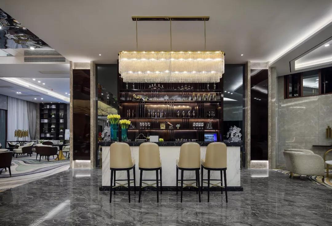 室内设计师用亮光烤漆木饰面的展示柜结合艺术陈设摆件让空间意境悠然,与荆州本地的深厚文化底蕴交相呼应,传统回形纹地毯、简单桌椅的装饰组合,呈现出沉稳安静的色调和层次丰富的质感,让人感受到底蕴深厚的现代典雅与低调轻奢的品质生活。大理石吧台干净利落的的出现,白色的简约天花造型,为开阔的空间创建了清晰的视觉框架。