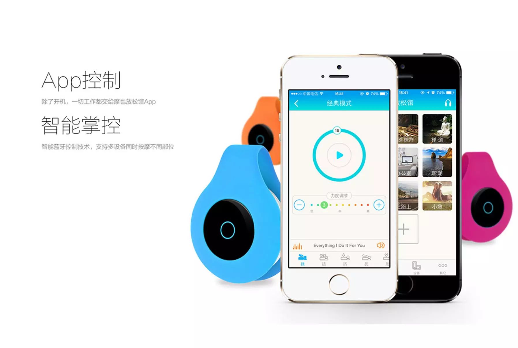 产品最大的亮点在于其提供了全新的减压按摩方式,可以和身体的各个部位贴合,通过手机APP进行按摩模式和强度调节,即实现了产品功能的延展,又节约了开发制造成本。在各种环境中都可使用,帮助用户随时随地实现全身放松,可折叠收纳设计,让用户更方便携带,符合现代人的生活方式。