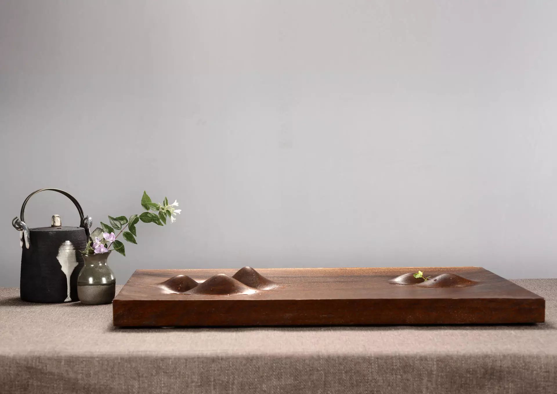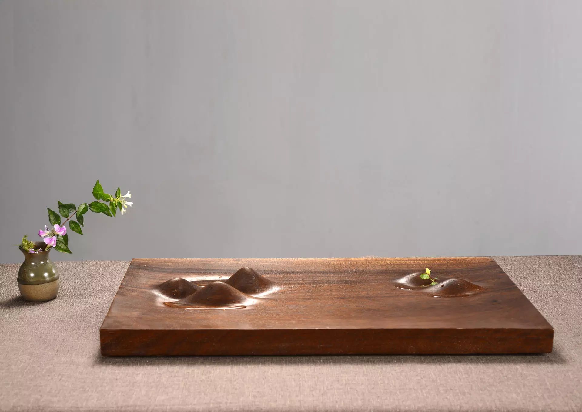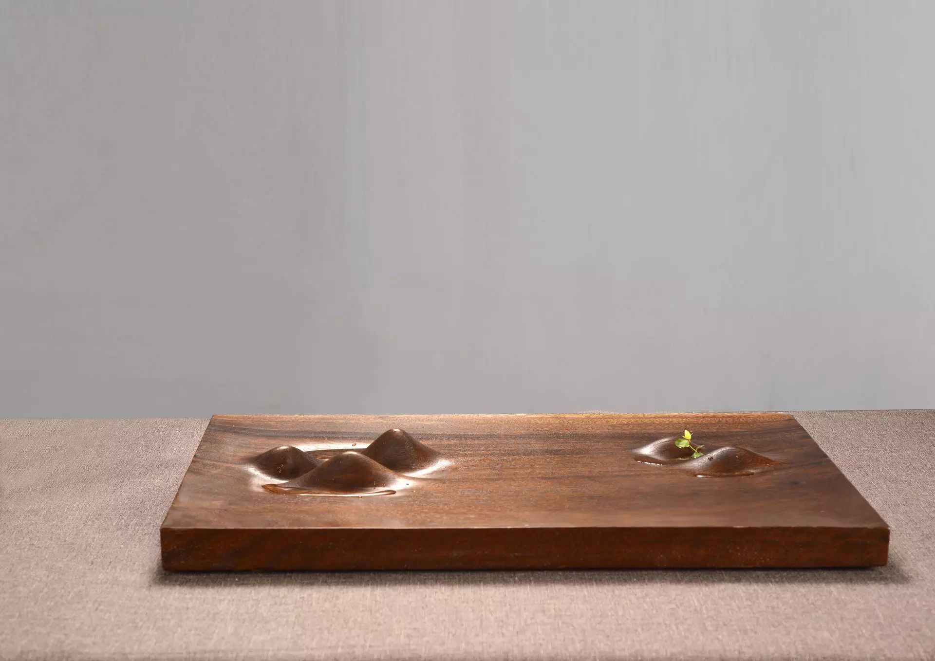 “之前我设计过【山水茶盘】和【溪流茶盘】后面会和大家分享。‘山水这次我们玩真的’,这是一个造景茶盘,由天然山石与人工茶台组合而成,可谓是一半人工,一半天成。我们这一代的年轻人正处在一个大变革的时代,生活、工作的压力时常让我们很迷茫。内心的压力无处释放,生活在一线城市的我们,内心都向往着自然山水,放空心灵,因此节假日就变成我们的迁徙日,不想而被堵在路上,不仅看不到山水,还为出行而烦恼!所以我想把大自然带回家中,置于案头,让我们在每个清晨、午后、或者晚饭后都能享受到大自然的景象!其实我所设计的不是茶盘,而是在这个钢筋水泥浇筑的城市中寻找一个自由、放松的空间,一山一水,一个人、一壶茶、一本书自悟人生路或是约上三五好友一起品茶论道,领略生命的宽度!