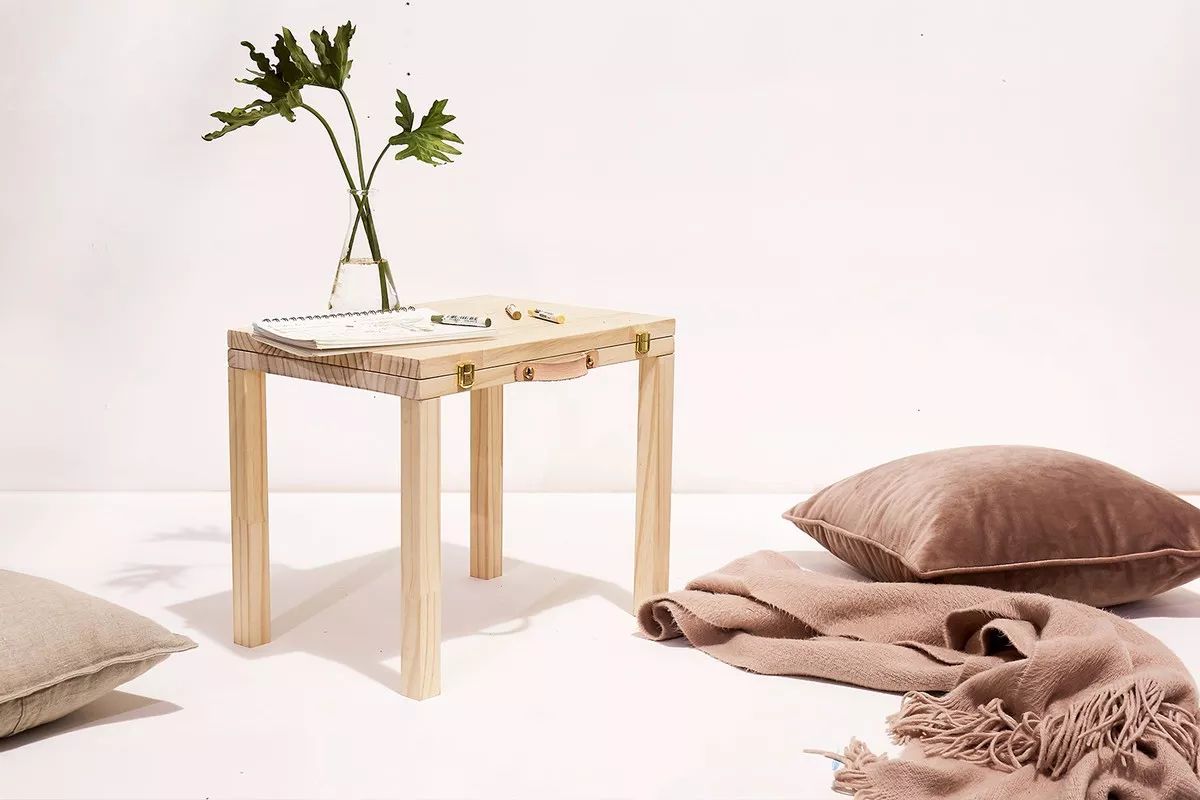 游牧箱的造型灵感来自于一只手提箱。但不同的是,箱内的四条腿可以安装在箱子底部,使普通手提箱兼具边桌和凳子的功能。