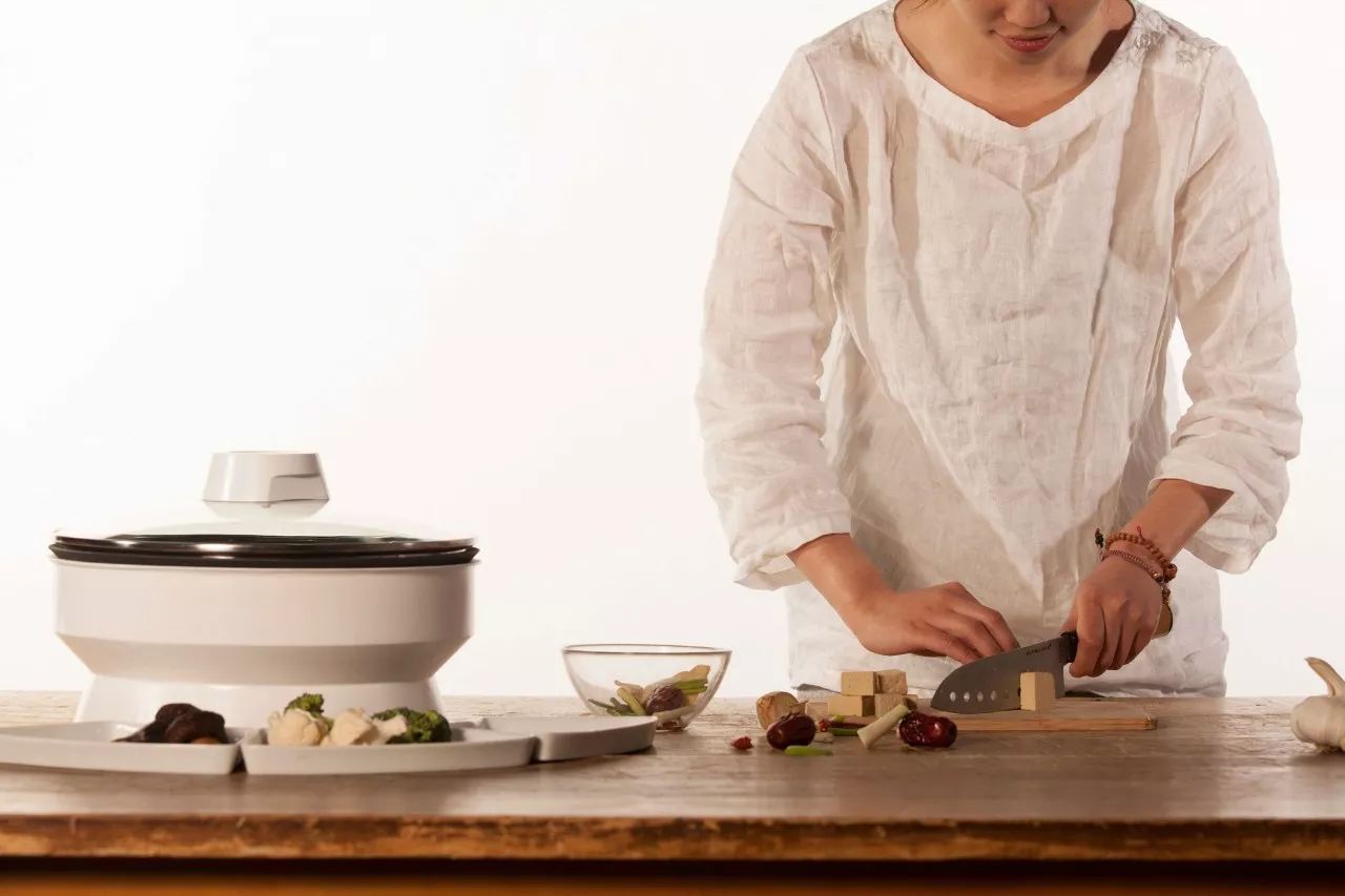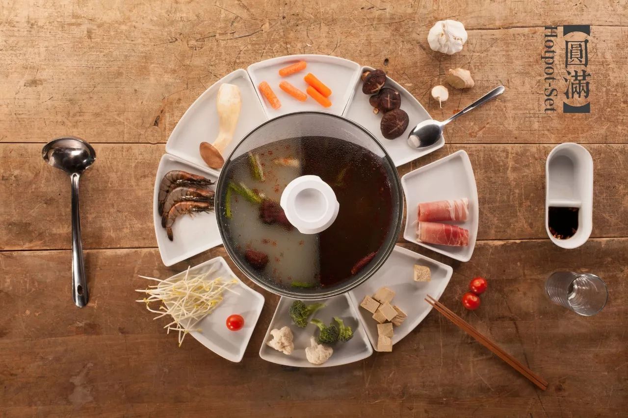 火锅套组包括一个电火锅主体,食材盘及调料碗。雕塑外形的锅体借鉴传统铜锣火锅的造型,同时也对用户体验进行了优化,譬如:火锅造型保证了每个食客获得相同的体验;降低了可能引发的安全问题,保证使用时的卫生与清洁。圆满火锅试图在延续传统理念的同时,透过理性对传统进行再一次的解读。