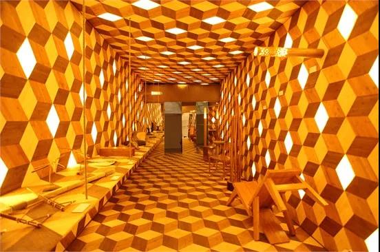 房内部“竹光”全暗效果,如果不开灯,使用者看到的是由三种不同色阶组成的拼花竹板材。