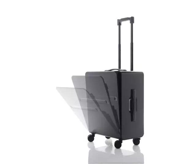 有别于传统硬壳旅行箱的中缝开盖设计,这款旅行箱通过颠覆性的U型铝镁合金骨架结构,将开合部位设计在前面板,结合碳纤维坚硬的特性,保证前面板的轻薄体量与刚性构造,释放出更多可利用的箱体空间。拉杆中间,嵌入了智能中枢系统,提供了移动电源与便捷充电装置。
