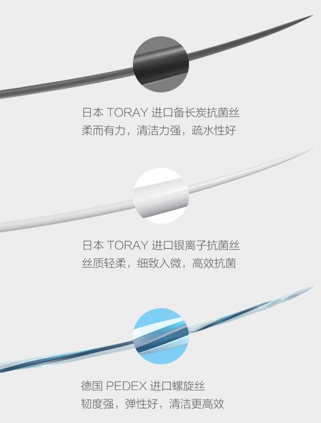 我们严选磨尖细丝的的发明者日本Toray最高品质的白色抗菌丝和备长炭抗菌丝,以及螺旋丝的发明者德国Pedex的螺 旋原丝,这些刷丝非常昂贵,根根都是刷丝中的爱马仕。有一个数据可以帮助理解这些刷丝好在哪里,Toray只挑选它生产的 50%最好的刷丝才出货。